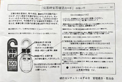 本日(3月8日)以下の防災安否確認カードが配布されました。